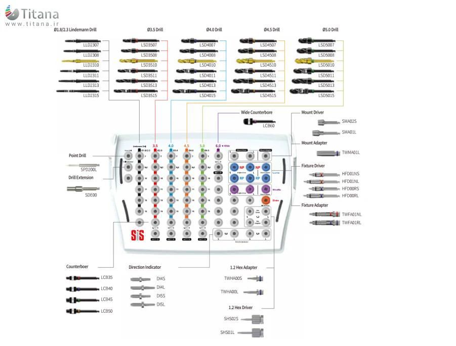 1 عدد رچت تورک رنج 1 عدد نگهدارنده مانت (Mount) 1 عدد گیج عمق سنج 1 عدد گوده تیتانیومی 1عدد پوینت دریل 1 عدد دریل اکستنشن 25 عدد دریل با استاپر ثابت 5 عدد دریل با طول 15 بدون استاپر 2 عدد درایور مانت (برای فیسکچر های مانت دار) 1 عدد درایور آداپتور مانت (برای فیسکچر های مانت دار) 6 عدد درایور فیکسچر/ مینی/ رگولار (موتور و رچت) 4 عدد هگز درایور (دستی / رچت ) 4 عدد پین توازی (مینی / رگولار)