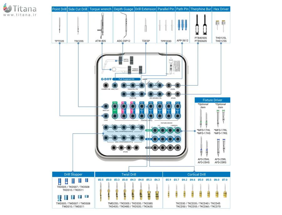1 عدد رچت تورک رنچ 1 عدد گیج عمق سنج 1 عدد دریل اکستنشن 3 عدد پین توازی (Parallel Pin) 3 عدد پین مسیر (Path Pin) 2 عدد دریل ترفاین 2 عدد هگز درایور 1 عدد مارکینگ دریل 1 عدد دریل لایندرمن 8 عدد دریل بدون استاپرثابت 8 عدد نک دریل(کانتر سینک/کورتیکال دریل) 10 عدد استاپر متحرک 10 عدد درایور فیکسچر (موتور و رچت)